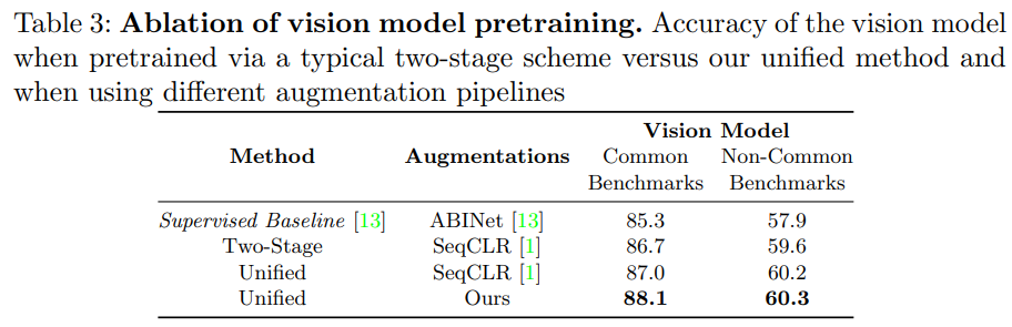 可以看到,在视觉预训练阶段,统一自监督预训练和强监督预训练比分阶段的训练效果要好。