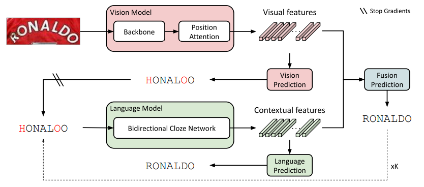 首先,本文的文字识别框架采用的是ABINet。大致流程如下:首先,视觉模型首先提取图像的特征序列并将其解码成字符序列;接着,将字符序列输入给语言模型,得到文本的语义特征;最后,使用一个融合模块,将视觉和语义特征进行融合,得到最终的识别结果。为了进一步提高识别性能,可以采用迭代的方式,多次对识别结果进行微调。