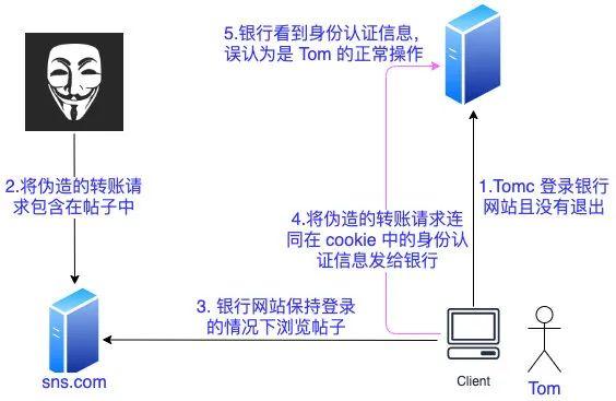 攻击者通过一些技术手段欺骗用户的浏览器去访问一个自己曾经认证过的网站并运行一些操作(如发邮件,发消息,甚至财产操作如转账和购买商品)。由于浏览器曾经认证过(cookie 里带来 sessionId 等身份认证的信息),所以被访问的网站会认为是真正的用户操作而去运行。