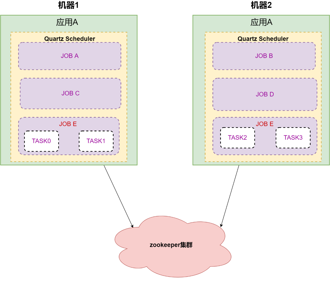 应用A在启动后, 5个任务通过 Zookeeper 协调后被分配到两台机器上,通过Quartz Scheduler 分开执行不同的任务。