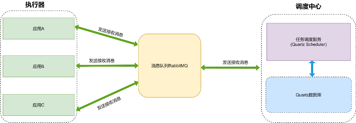 调度中心依赖Quartz集群模式,当任务调度时候,发送消息到RabbitMQ 。业务应用收到任务消息后,消费任务信息。