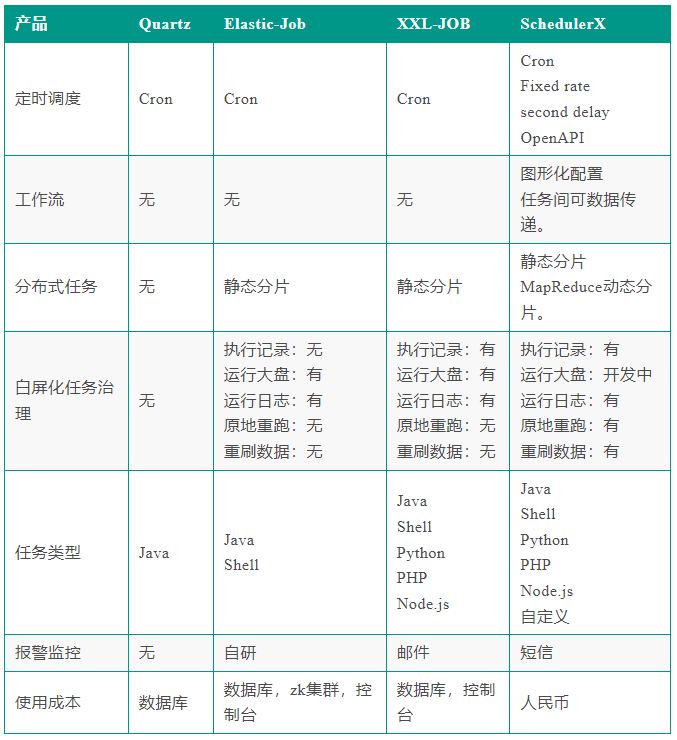 首先我们将任务调度开源产品和商业产品 SchedulerX 放在一起,生成一张对照表: