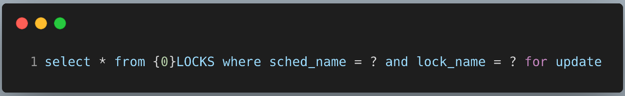 scheduler实例在集群模式下首先获取{0}LOCKS表中的行锁,Mysql 获取行锁的语句:
