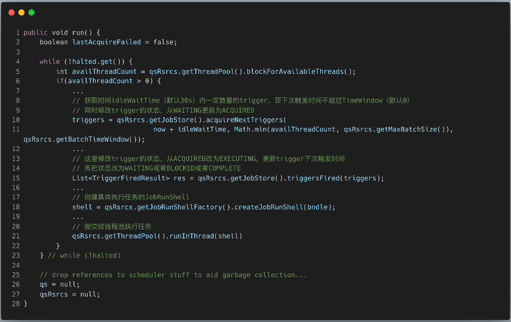 执行任务调度的核心类是 QuartzSchedulerThread 。