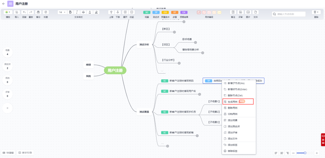 右键点击场景或者测试点,选择“生成用例”,思维导图中打过标签的预置条件、步骤和预期结果自动生成在测试用例中。