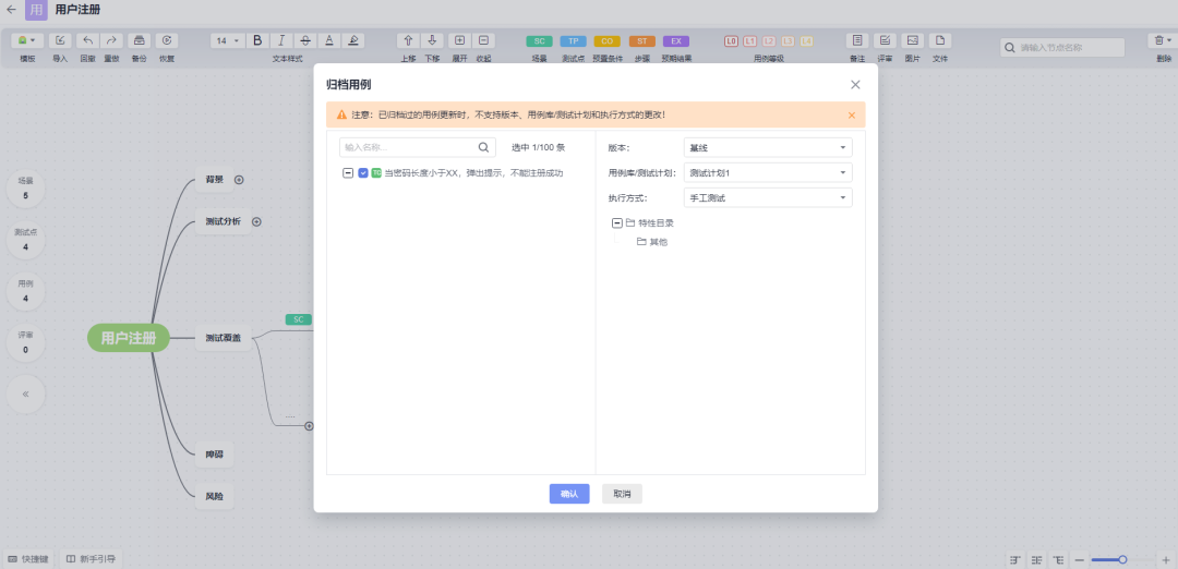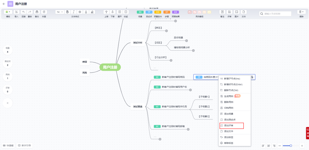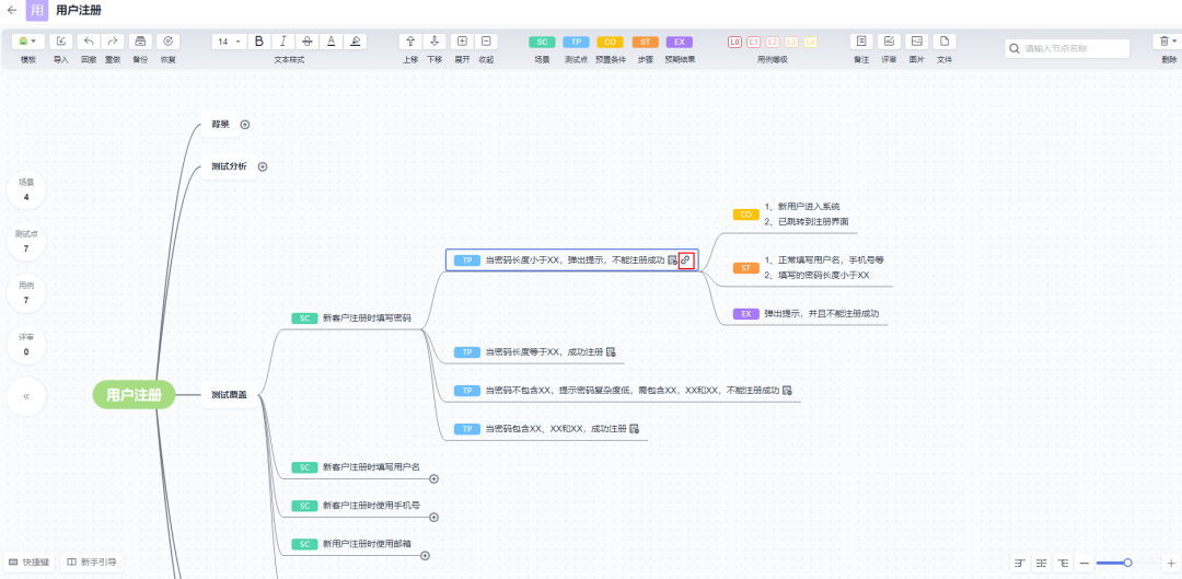 通过下图红框中的标签,设置“测试覆盖”节点中总结的多个场景,以及多个测试点(测试点的名字就是以后自动生成用例的名字),包括测试点的子节点的预置条件,步骤和预期结果。整个脑图设计的过程就结束了,下面是最重要的环节“生成/评审/归档用例”!
