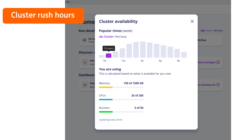目前我们正在考虑增加集群高峰时段展示的功能,为用户提供更多的集群使用状态和压力等信息,在自助服务平台用户视角来看,用户按照集群的繁忙程度选择自己任务的开始时间,这样可以避免后台复杂的配置就可以获得高性能的运算体验。