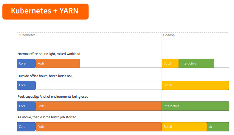 Kubernetes和YARN共同工作时,由于Kubernetes和Hadoop资源是静态划分的,在正常办公时间,Hadoop应用和Kubernetes各自使用自身分配资源,即便spark任务压力大也无法借用更多资源。夜晚时间,集群中仅有批处理任务,Kubernetes资源全部空闲,却无法分配给Hadoop进行有效利用,对于调度平台来讲,这不是一种最佳的资源分配方式。