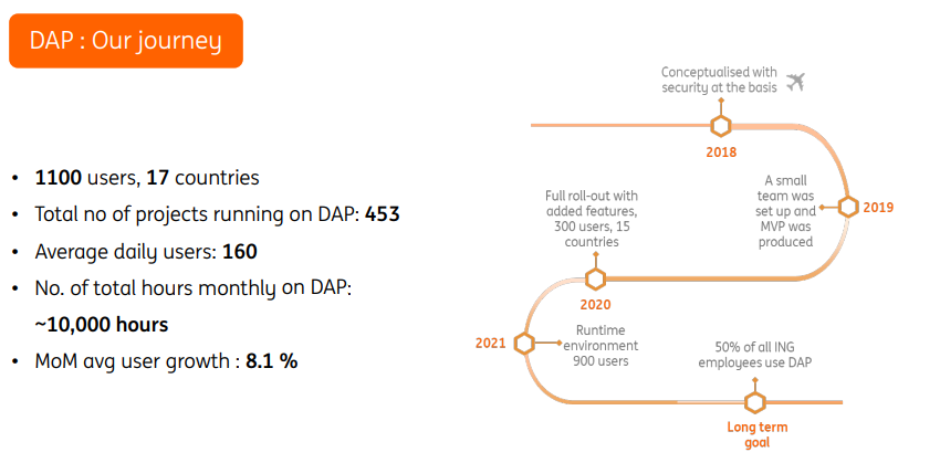 在银行行业有许多法规和限制,如:监管要求在全球范围内各不相同、数据孤岛-全局和本地限制、数据安全、合规创新等,想要快速引入新技术不是一件容易的事情,为此,ING布局符合自身产业的DAP平台(Data Analytics Platform),为全球50%的ING员工提供安全的、自助的端到端分析能力,帮助员工在数据平台之上构建并解决业务问题。