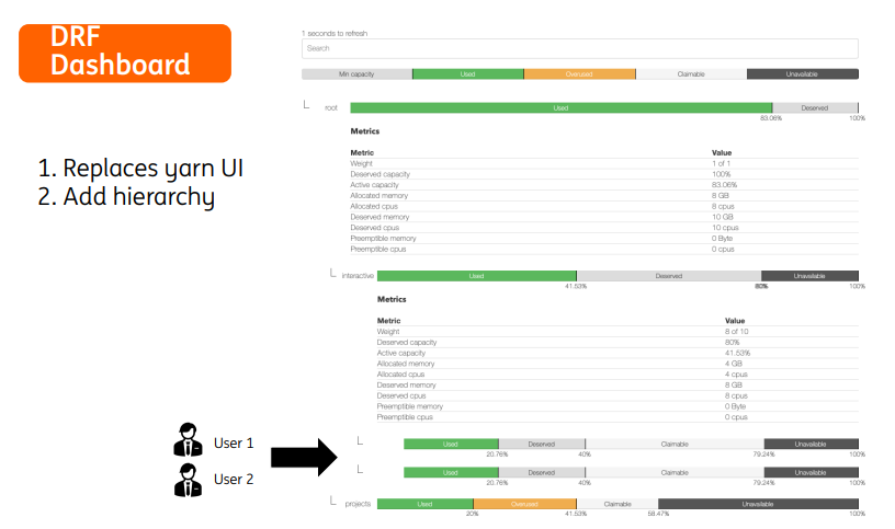 比如集群资源总量为CPU:18C,Memory:72GB,两个用户分别是User1和User2,每个User分配1个队列,在提交作业时会根据主导资源计算job的调度优先级。