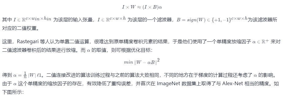 之前的二值连接算法只对权重进行了二值化,但是网络的中间输出值依然是单精度的,于是 Rastegari 等人对此进行了改进,提出用单精度对角阵与二值矩阵之积来近似表示原矩阵的算法,以提升二值网络的分类性能,弥补二值网络在精度上弱势。该算法将原卷积运算分解为如下过程: