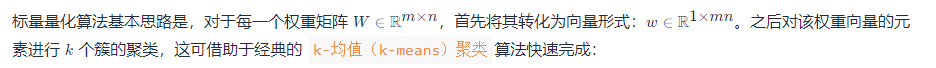相比于剪枝操作,参数量化则是一种常用的后端压缩技术。所谓“量化”,是指从权重中归纳出若干“代表”,由这些“代表”来表示某一类权重的具体数值。“代表”被存储在码本(codebook)之中,而原权重矩阵只需记录各自“代表”的索引即可,从而极大地降低了存储开销。这种思想可类比于经典的词包模型(bag-of-words model)。常用量化算法如下: