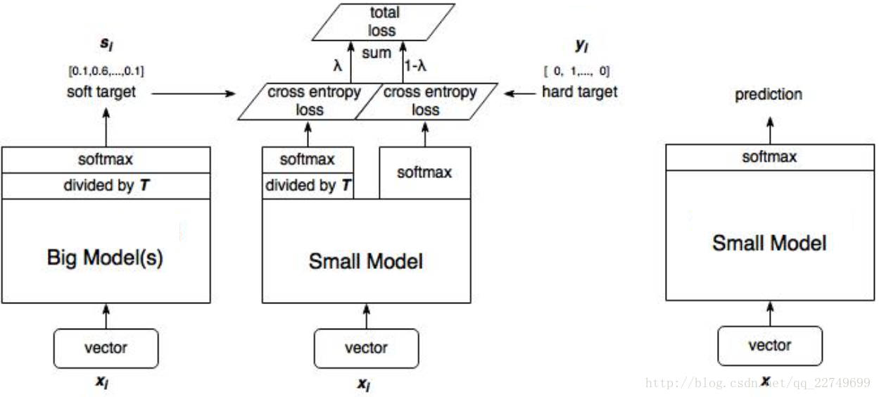 # 将类别标签进行one-hot编码 one_hot = tf.one_hot(y, n_classes,1.0,0.0) # n_classes为类别总数, n为类别标签 # one_hot = tf.cast(one_hot_int, tf.float32) teacher_tau = tf.scalar_mul(1.0/args.tau, teacher) # teacher为teacher模型直接输出张量, tau为温度系数T student_tau = tf.scalar_mul(1.0/args.tau, student) # 将模型直接输出logits张量student处于温度系数T objective1 = tf.nn.sigmoid_cross_entropy_with_logits(student_tau, one_hot) objective2 = tf.scalar_mul(0.5, tf.square(student_tau-teacher_tau)) """ student模型最终的损失函数由两部分组成: 第一项是由小模型的预测结果与大模型的“软标签”所构成的交叉熵(cross entroy); 第二项为预测结果与普通类别标签的交叉熵。 """ tf_loss = (args.lamda*tf.reduce_sum(objective1) + (1-args.lamda)*tf.reduce_sum(objective2))/batch_size