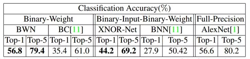 可以看到的是权重二值化神经网络(BWN)和全精度神经网络的精确度几乎一样,但是与异或神经网络(XNOR-Net)相比而言,Top-1 和 Top-5 都有 10+% 的损失。