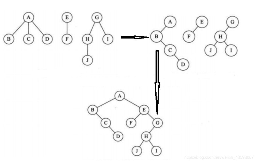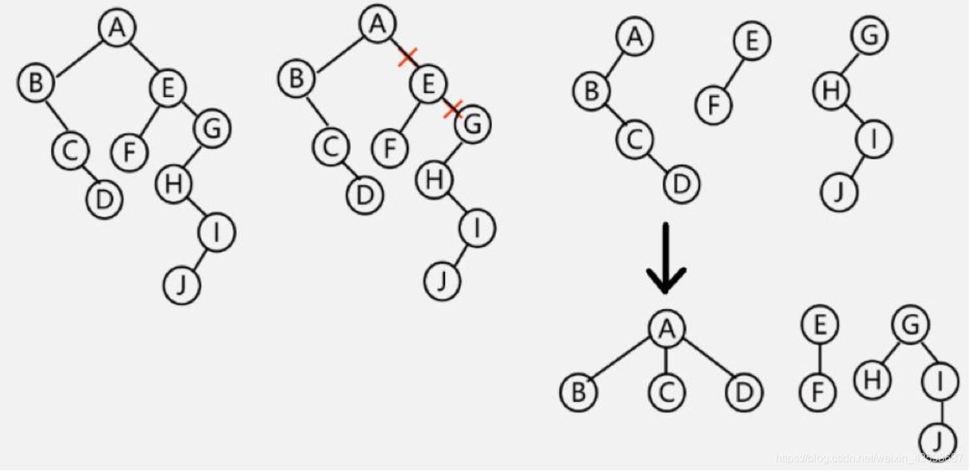 - 若二叉树非空,则二叉树的根及其左子树为第一棵树的二叉树形式,将根与右子树断开