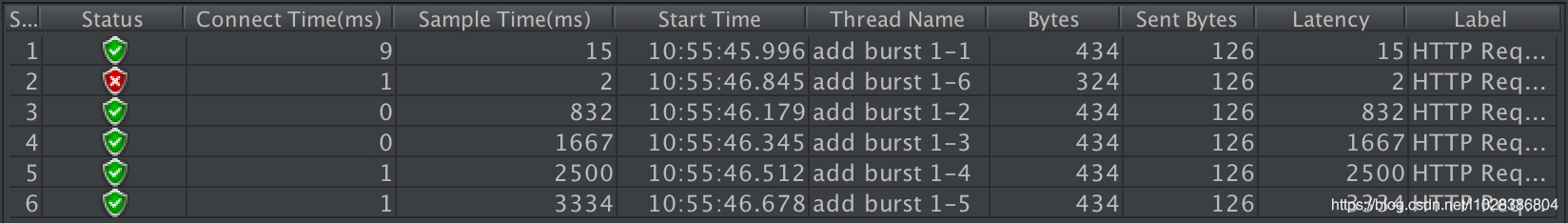 相比实例一成功数增加了4个,这个我们设置的burst数目是一致的。具体处理流程是:1个请求被立即处理,4个请求被放到burst队列里,另外一个请求被拒绝。通过burst参数,我们使得Nginx限流具备了缓存处理突发流量的能力。