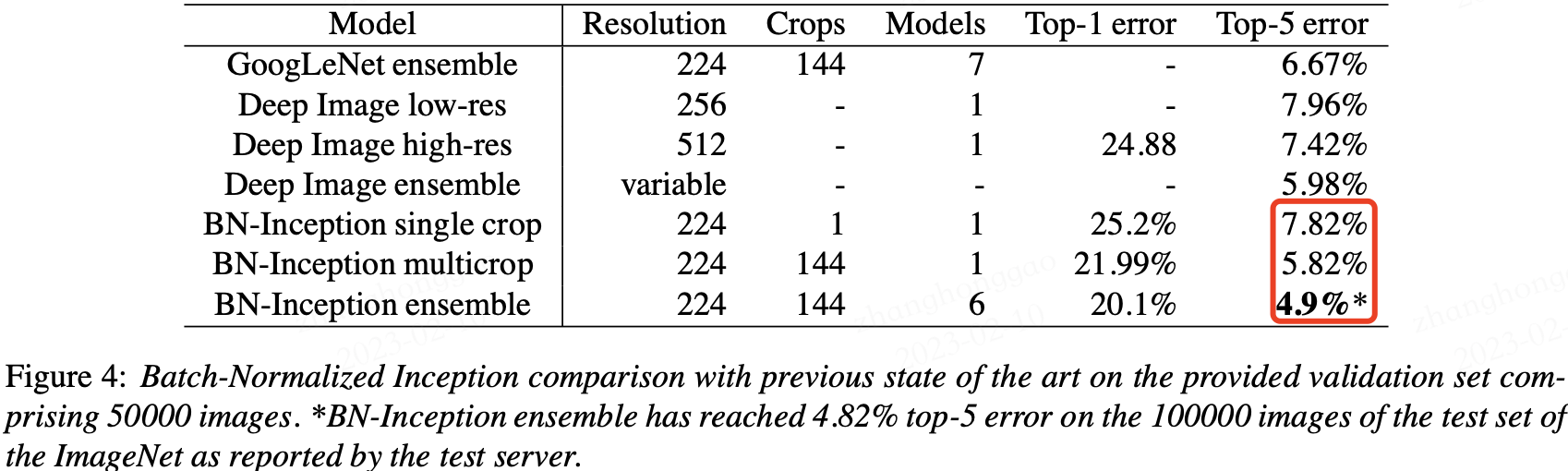 BN 在 ImageNet 分类数据集上实验结果是 SOTA 的,如下表所示: