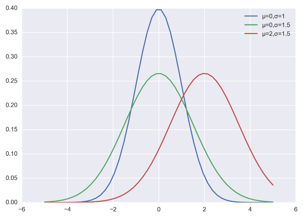 import numpy as np import matplotlib.pyplot as plt plt.figure(dpi = 200) plt.style.use('seaborn-darkgrid') # 主题设置 def nd_func(x, sigma, mu): """自定义实现正太分布的概率密度函数 """ a = - (x-mu)**2 / (2*sigma*sigma) f = np.exp(a) / (sigma * np.sqrt(2*np.pi)) return f if __name__ == '__main__': x = np.linspace(-5, 5) f = nd_fun(x, 1, 0) p1, = plt.plot(x, f) f = nd_fun(x, 1.5, 0) p2, = plt.plot(x, f) f = nd_fun(x, 1.5, 2) p3, = plt.plot(x, f) plt.legend([p1 ,p2, p3], ["μ=0,σ=1", "μ=0,σ=1.5", "μ=2,σ=1.5"]) plt.show()