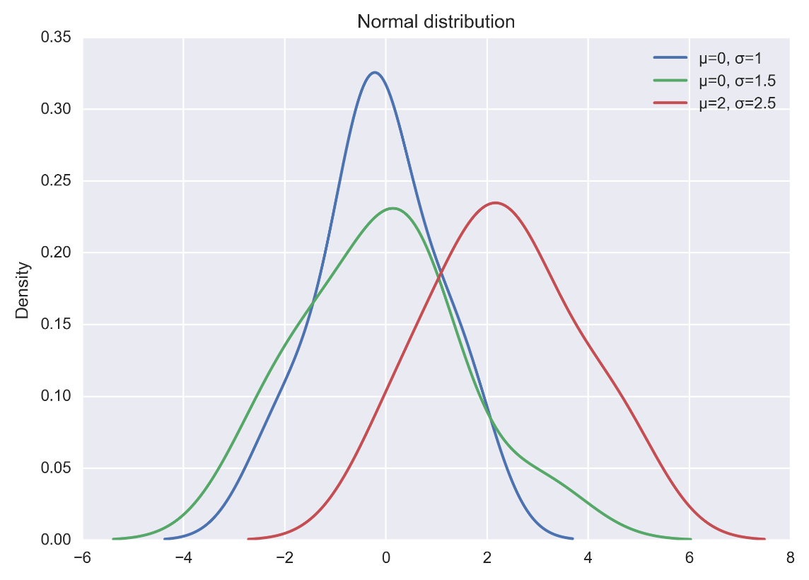 import seaborn as sns x1 = np.random.normal(0, 1, 100) x2 = np.random.normal(0, 1.5, 100) x3 = np.random.normal(2, 1.5, 100) plt.figure(dpi = 200) sns.kdeplot(x1, label="μ=0, σ=1") sns.kdeplot(x2, label="μ=0, σ=1.5") sns.kdeplot(x3, label="μ=2, σ=2.5") #显示图例 plt.legend() #添加标题 plt.title("Normal distribution") plt.show()