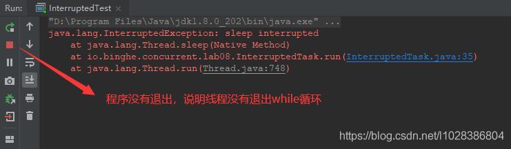 上述代码明明调用了线程的interrupt()方法来中断线程,但是却并没有起到啥作用。原因是线程的run()方法在执行的时候,大部分时间都是阻塞在sleep(100)上,当其他线程通过调用执行线程的interrupt()方法来中断执行线程时,大概率的会触发InterruptedException异常,在触发InterruptedException异常的同时,JVM会同时把线程的中断标志位清除,所以,这个时候在run()方法中判断的currentThread.isInterrupted()会返回false,也就不会退出当前while循环了。