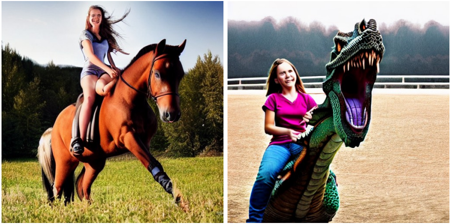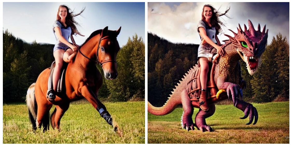 在得到描述对后,作者使用Stable Diffusion将编辑前与编辑后的描述转换成图像对。在这个过程中面临了一个挑战:即使输入提示只有微小的不同,生成的图像也无法保证内容的一致性,如分别使用“photograph of a girl riding a horse”和“photograph of a girl riding a dragon”为提示生成图像,会得到下图内容: