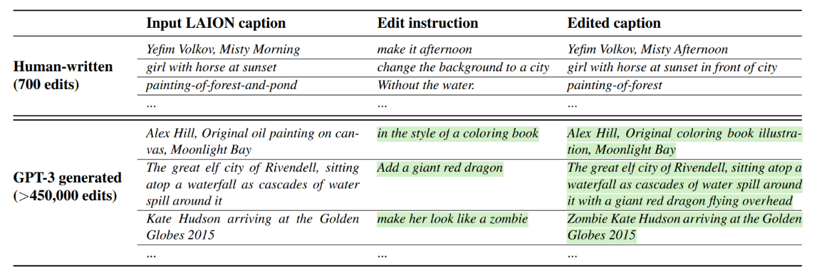 作者使用了700条人工标注的文本编辑指令三元组微调GPT-3,之后使用微调过的GPT-3生成大规模的文本三元组。如下图,文本三元组包括(1)输入描述;(2)编辑指令;(3)编辑后的描述。