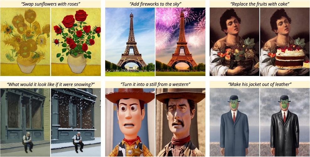 InstructPix2Pix提出了一种使用文本编辑图像的方法:给定输入图像和编辑指令,告诉模型要做什么,模型将遵循这些指令来编辑图像,如: