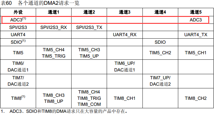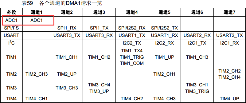 查阅参考手册DMA篇章可得,ADC1对应DMA1的通道1,ADC3对应DMA2的通道5,而ADC2则没有DMA功能。如图22-1,图22-2。所以,这里我们选择ADC1,其对应了DMA1的通道1。