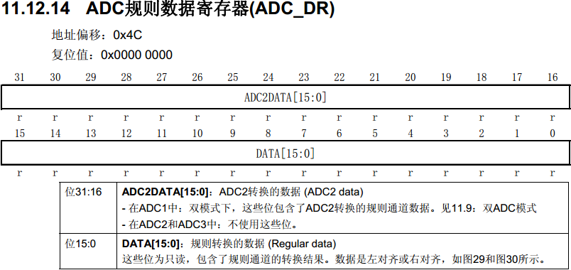 简单来讲,规则同步模式即为ADC1和ADC2同时转换规则通道组,其中ADC1为主,ADC2为从。ADC1转换的结果放在ADC_DR的低16位,ADC2转换的结果放在ADC_DR的高16位。如图23-1为ADC_DR寄存器描述。