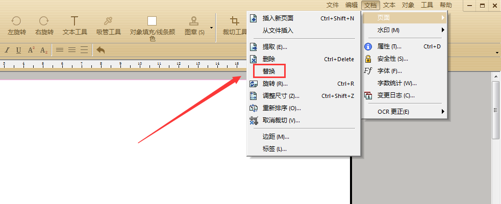 可以通过以下两种方式进行页面替换。方式1:选择编辑器右上角“文档”中的“页面”,再选择替换功能。