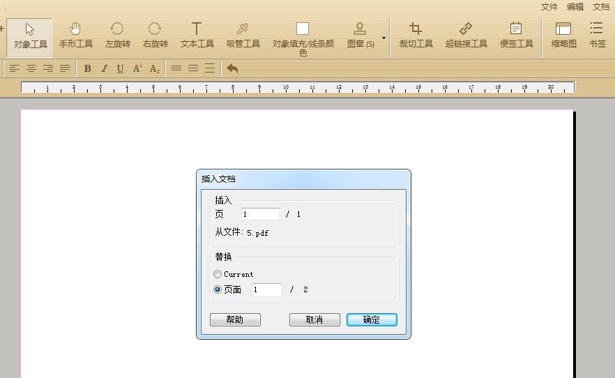 根据提示选择被替换的PDF文档后,在设置窗口分别输入被替换文档中页面的页码和现有文档的页码后点击确定就可以了。
