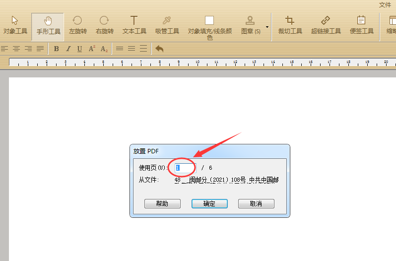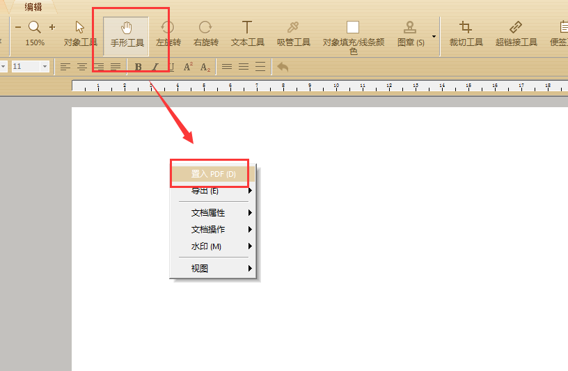 先将页面停留在需要进行被替换的位置后,选择编辑器上方菜单栏中的“手形工具”并在当前页面任意处右击并选择“置入”