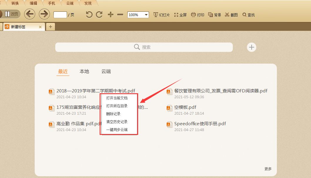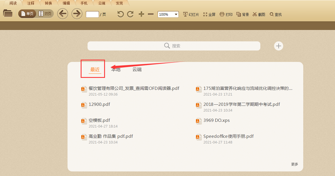 有时需要查看一个文件,但不记得文件保存到什么位置,就可以通过浏览记录来快速查看了,以极速PDF阅读器为例,双击打开软件后,在显示页面点击“最近”即可查看近期用该软件查看过的10条阅读记录,点击即可快速打开文件。
