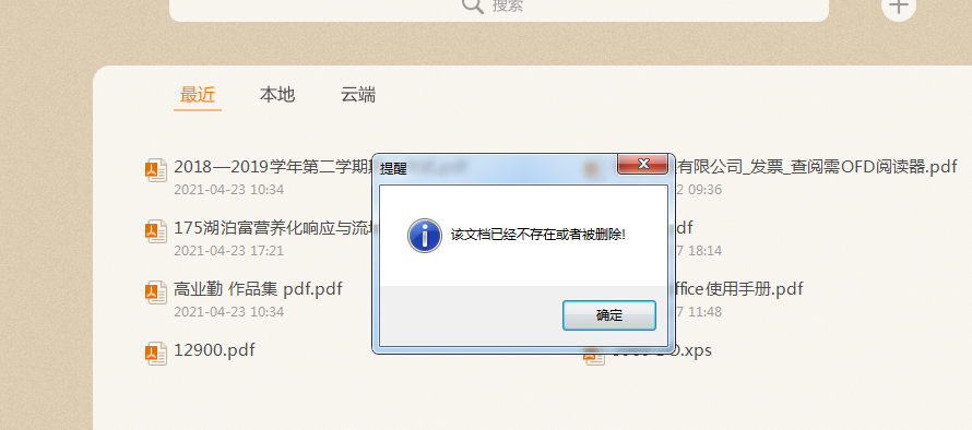 同时我们有注意到有些文档标题下有显示修改日期,而有些却没有,这部分没有日期显示的文档则是已经被删除或修改文件夹位置的。单击会弹出错误提示并自动清除该浏览记录。