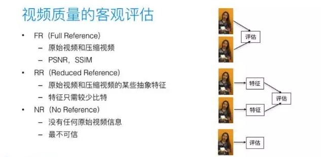 NR(No Reference):然而FR评估方法的最大问题在于,很多应用场景下,视频接收或播放端没有原始信号的信息,从而无法利用该方法。NR的方法只利用解码后的视频信号来估计视频中可能存在的质量问题。显而易见,此方法可能会极不准确。
