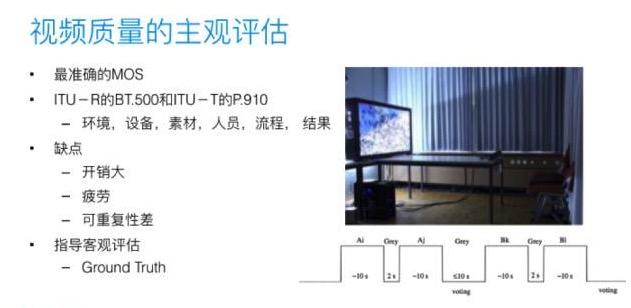 上图右侧,是一个国外实验室的设置。不能有外界光,主观评估的人的观看距离1.5米。播放一个视频序列A,用I的方法处理,看10秒钟,中间停隔两秒,再用G的方法处理,看10秒钟,评估人有10秒时间打分,I好还是G好,I比G好多少,一般五分制。接下来,在继续为视频序列B打分。一般这样的测试,需要40人参与。缺点显而易见的,开销很大。同时,这个测试也规定了每个人评估的时间不能超过半小时,会造成评估人疲劳,就不会细抠前后两个视频到底有多大的差别。同时,不同人评估的准则也不一致。高。