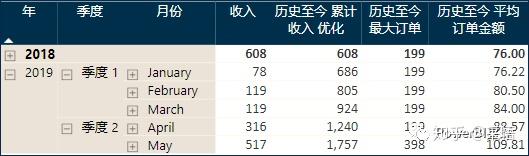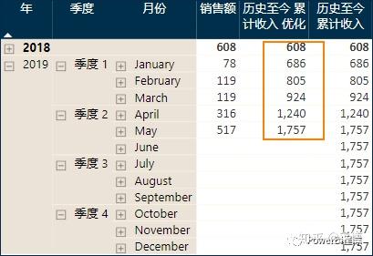 结果正是历史所有订单的累计销售额,这个度量值的关键是用MAX函数获取当前上下文的日期,然后返回小于等于当前日期的所有销售额的合计。