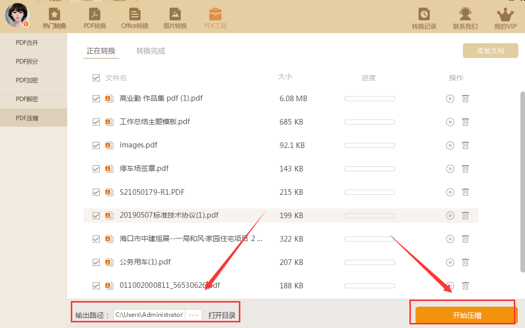 接着设置压缩后的PDF文件输出路径,这样处理完成后就可以直接在对应文件夹查看并打开文件了。设置好后点击右下角的开始压缩即可开始批量压缩。操作过程比较简单,如果压缩前没有设置输出路径,也可以点击打开目录在默认路径查看,或者在转换完成中查看即可。