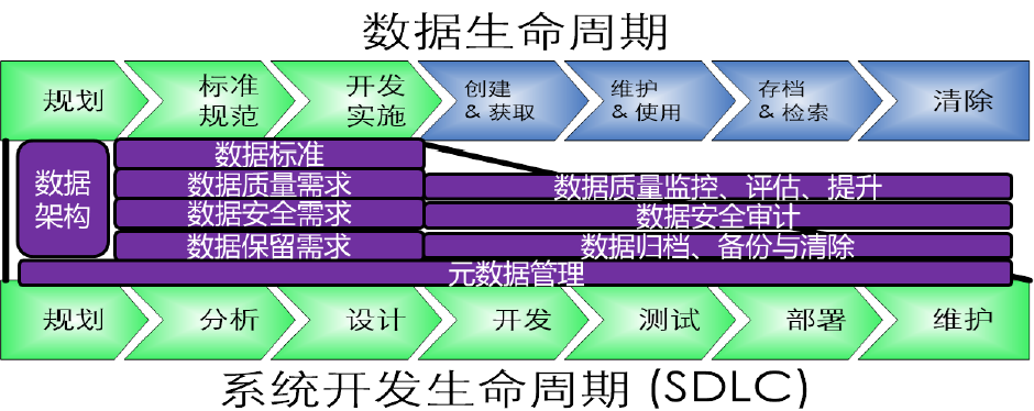 从时间视角上看,企业管理数据资产,就是管理数据的生命周期。数据首先被创建或获得,然后存储、维护和使用,最终被销毁。因而有效的数据管理,开始于数据获取之前,企业先期制定数据规划、定义数据规范,以期获得实现数据采集、交付、存储和控制所需的技术能力。