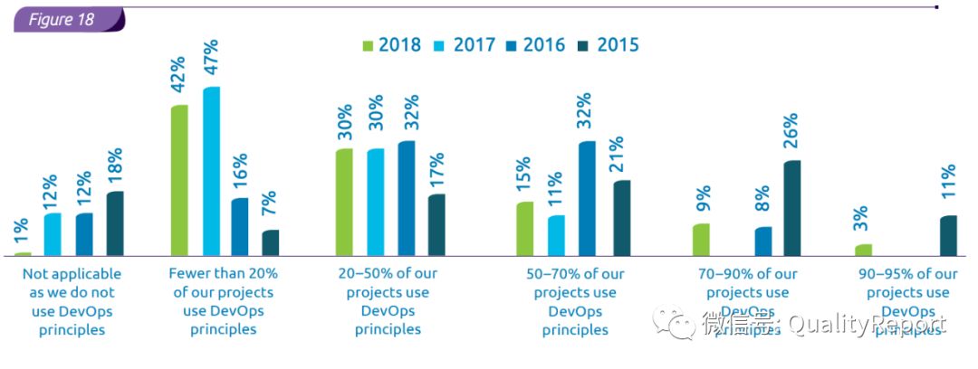 “速度上的质量”宣言推动着敏捷和DevOps逐渐被采用,有多达99%的受访者称他们至少有一些项目在采用DevOps。但是,有些组织以质量为代价去追求速度,这样是不妥的。也有的组织认为敏捷与瀑布共存的模式比较适合他们的组织、文化和业务的需求。