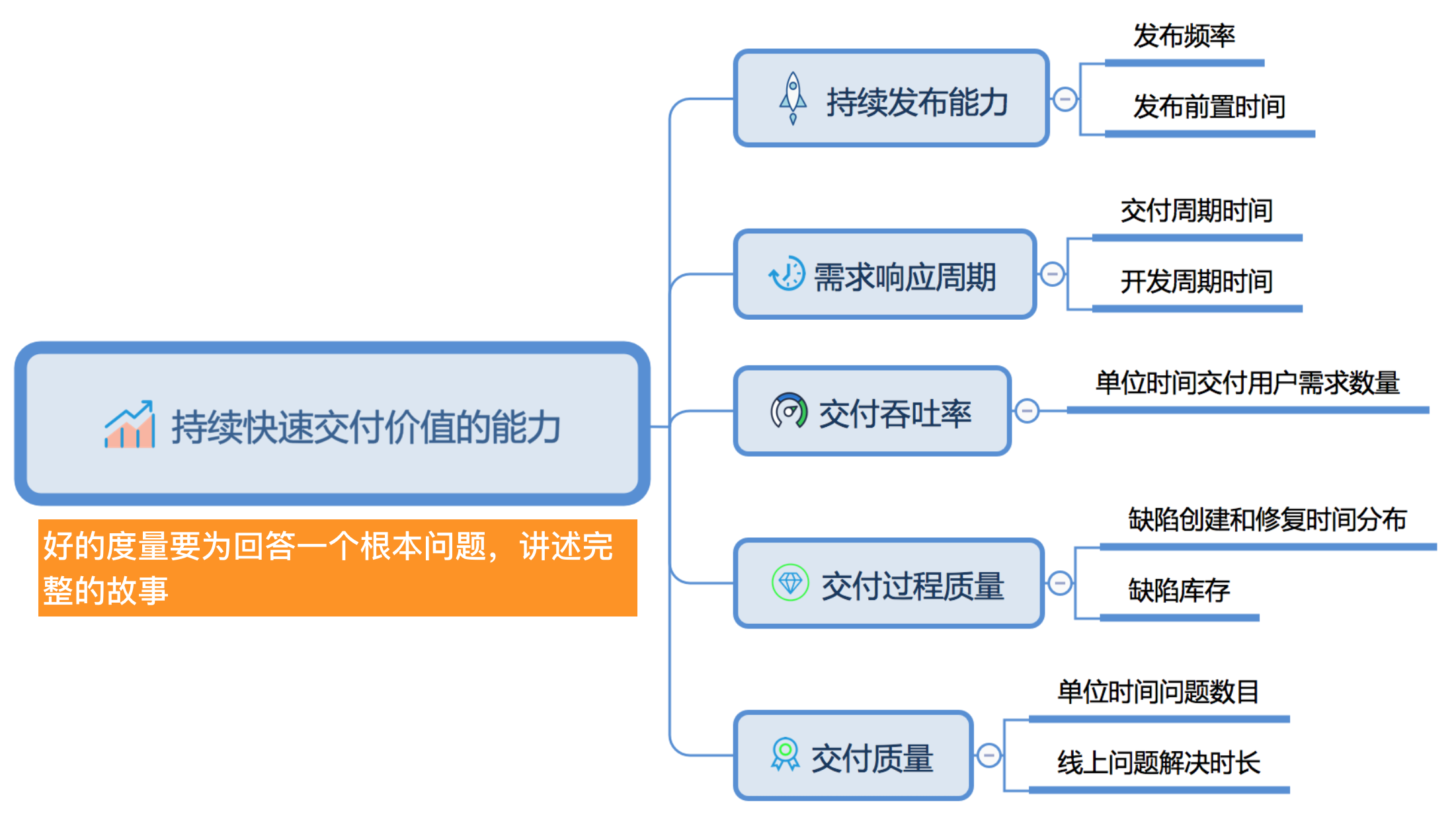 产品开发过程中会产生大量的数据,但数据不是度量。好的度量的标准是:它要为回答一个根本的问题讲述完整的故事。效能度量要回答的根本问题就是:一个组织“持续快速交付价值的能力”怎么样?