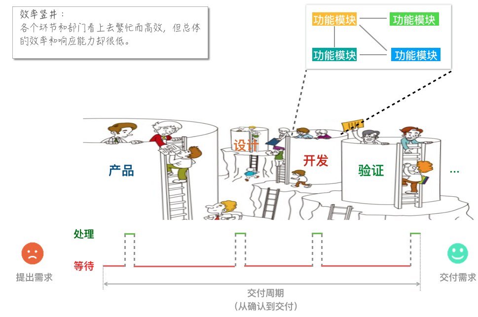 什么是效率竖井呢?上图描述了传统开发方式下,产品交付面临的普遍困境——各职能和部门局部优化带来一系列问题,如: