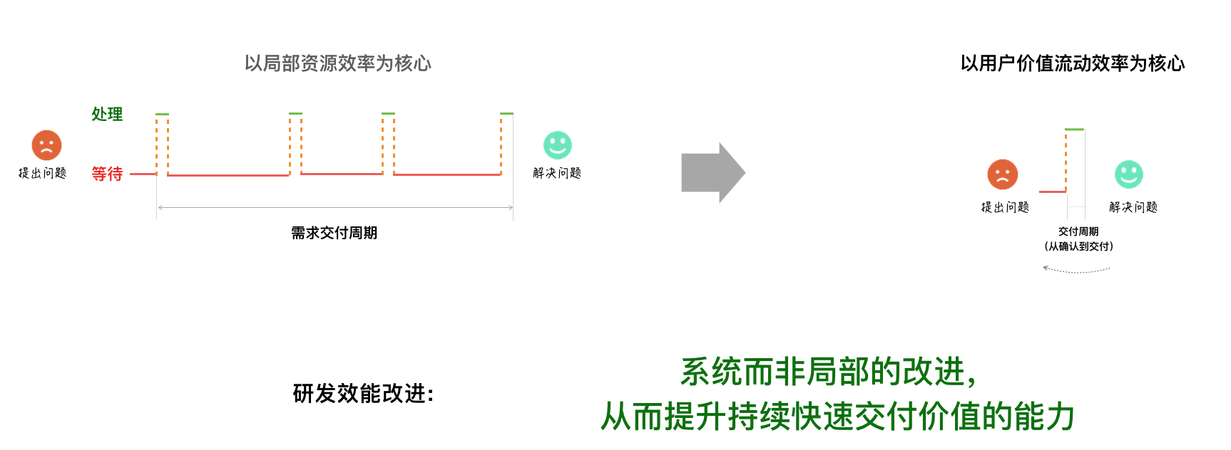 上图反映了效能改进的关键——从以局部资源效率为核心,转变为价值流动效率为核心的改进。