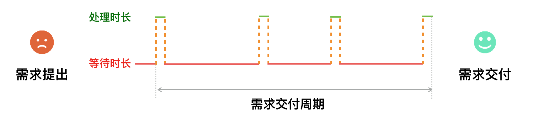 交付周期时间。指的是从确认用户提出的需求开始,到需求上线所经历的平均时长。它反映团队(包含业务、开发、运营等职能)对客户问题或业务机会的响应速度;