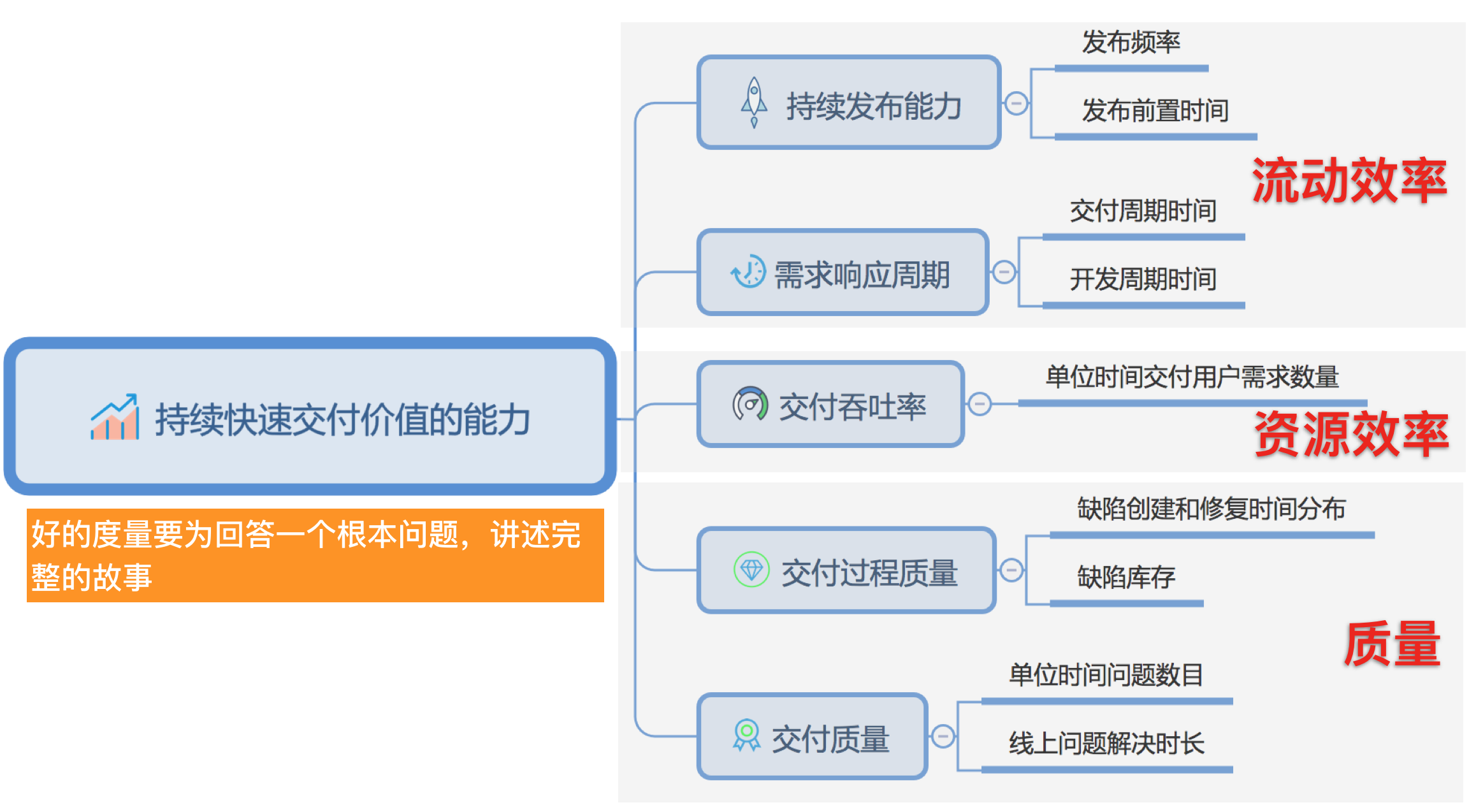 如上图所示,这5组指标,从流动效率、资源效率和质量三个方面讲述了一个完整的故事,回答了组织持续交付价值的能力如何这个核心问题。其中,持续发布能力和需求响应周期这两组指标反映价值的流动效率;吞吐率反映资源效率;交付过程质量和对外交付质量这两组指标共同反映质量水平。