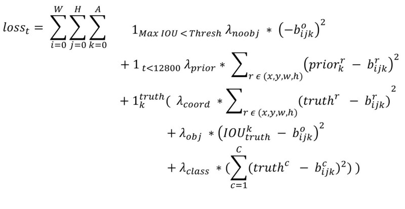 但是我看了YOLOv2的源码(训练样本处理与loss计算都包含在文件region_layer.c中,YOLO源码没有任何注释,反正我看了是直摇头),并且参考国外的blog以及allanzelener/YAD2K(Ng深度学习教程所参考的那个Keras实现)上的实现,发现YOLOv2的处理比原来的v1版本更加复杂。先给出loss计算公式: