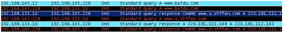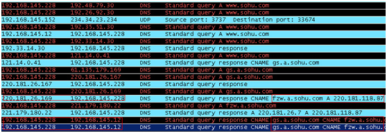 在192.168.145.228服务器上安装上wireshark软件,并打开它,设置数据包为UDP过滤,在192.168.145.12客户机上用nslookup命令查询一下http://www.sohu.com/,马上可以看到本地DNS服务器直接查全球13台根域中的某几台,然后一步步解析,通过递代的方式,直到找到www .sohu .com对应的IP为220.181.118.87。