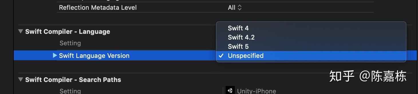 但是,需要注意的是,Unity直接导出的Xcode工程是没有指定Swift版本的。