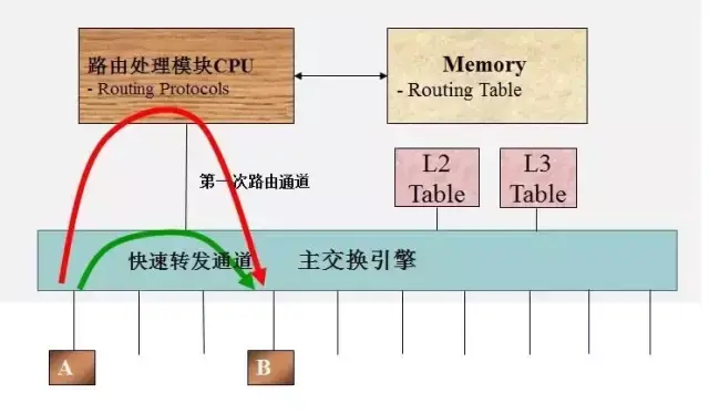 而三层交换机通过硬件执行数据包交换。三层交换机在对第一个数据包送控制面进行路由查找后,它将会产生一个供数据面查找的MAC地址与IP地址的映射表,当同样的数据流再次通过时,将根据此表查表通过而不是再次送控制面查路由(即“一次路由,多次交换”)。