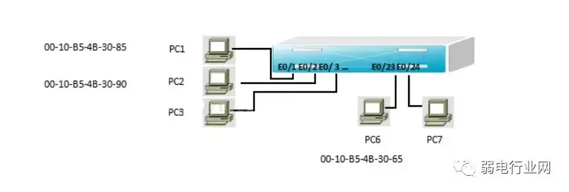 假设主机pc1向主机pc7发送一个数据帧,该数据帧被送到交换机后,交换机首先查MAC地址表,发现主机pc7连接在E0/24接口上,就将数据帧从E0/24接口转发出去。